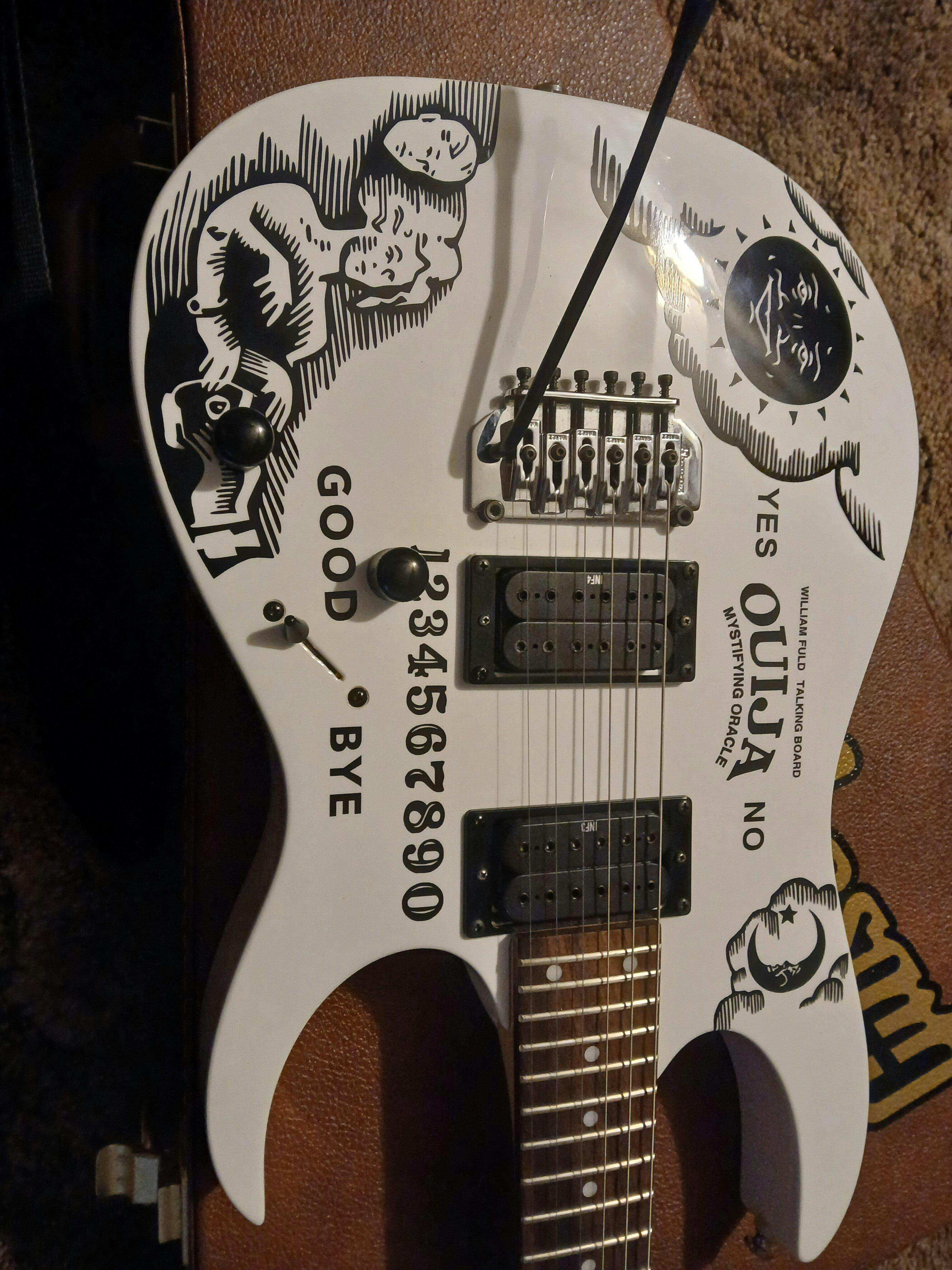 Kirk Hammett Ouija Decal Guitar Body Graphic Decal Set. Choose from black, white, metallic Gold and glow in the dark vinyl peel & Stick